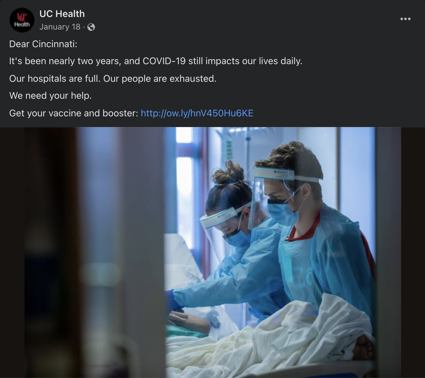 Early on in my time with UC Health, COVID-19 dangerous misinformation was continuously making the rounds on social media. As a leader in the Great Cincinnati region, it was our duty to set the record straight and to protect our community through a series of content aimed to clarify the questions and concerns around the severity of COVID and vaccine information.
