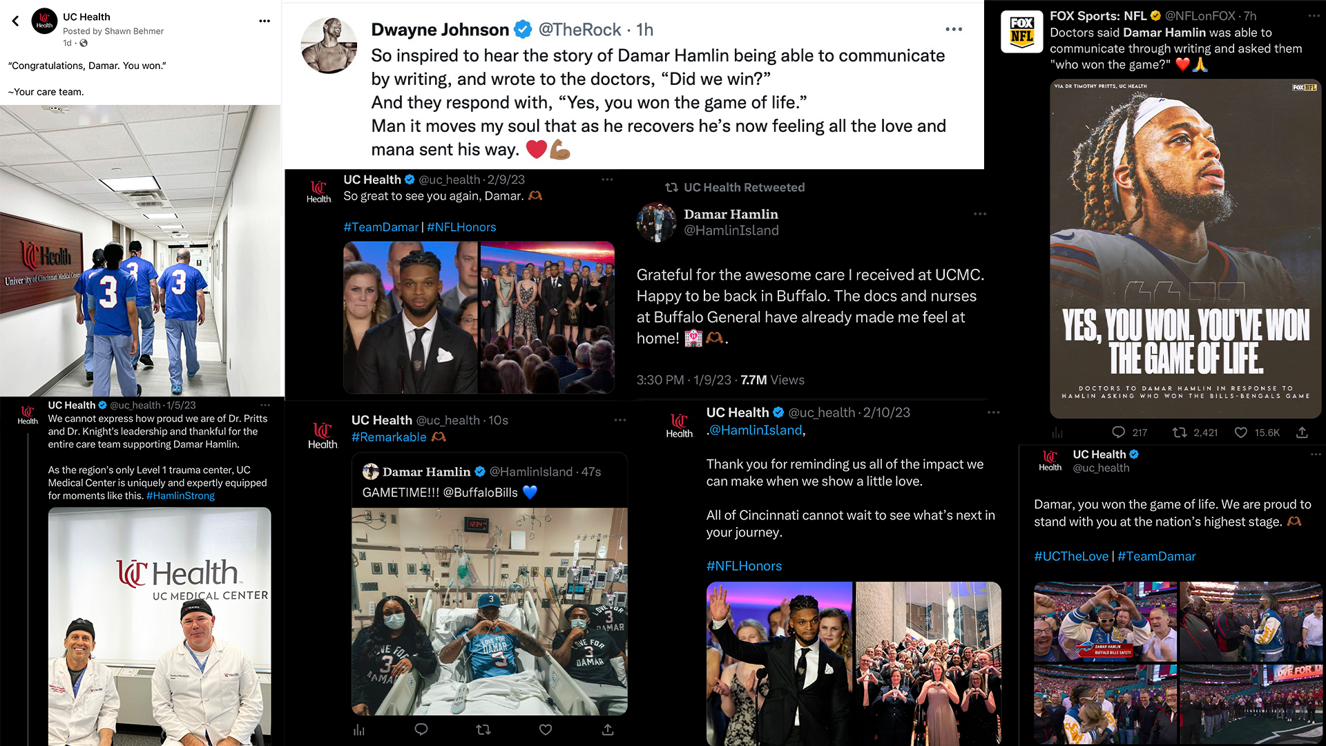 Just a day after the New Year began, Bills Safety, Damar Hamlin, suffered cardiac arrest during the game against the Bengals and was immediately taken to UC Medical Center. During his 10-day stay with the system, our marketing department activated crisis communication protocol as the world was watching the events unfold.
